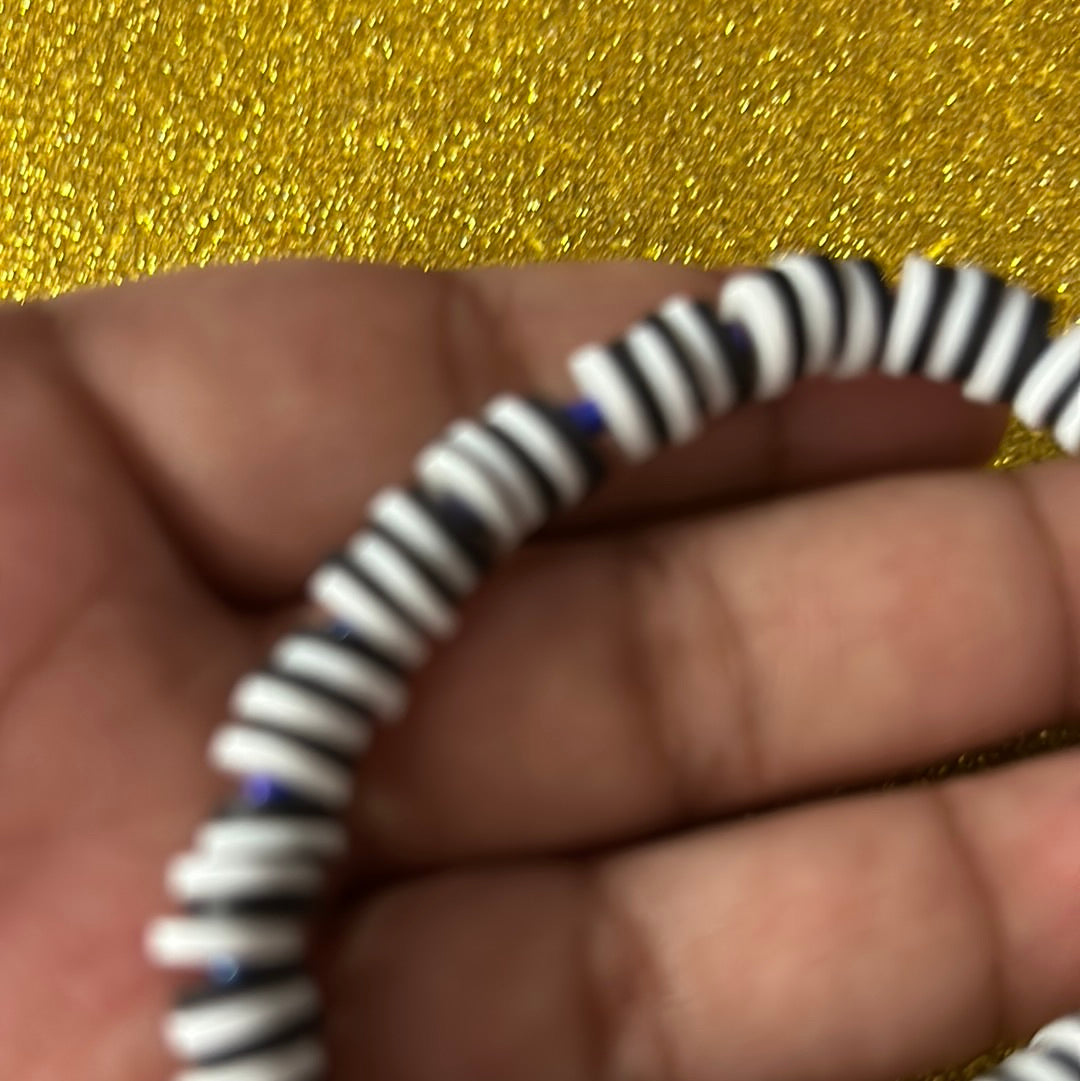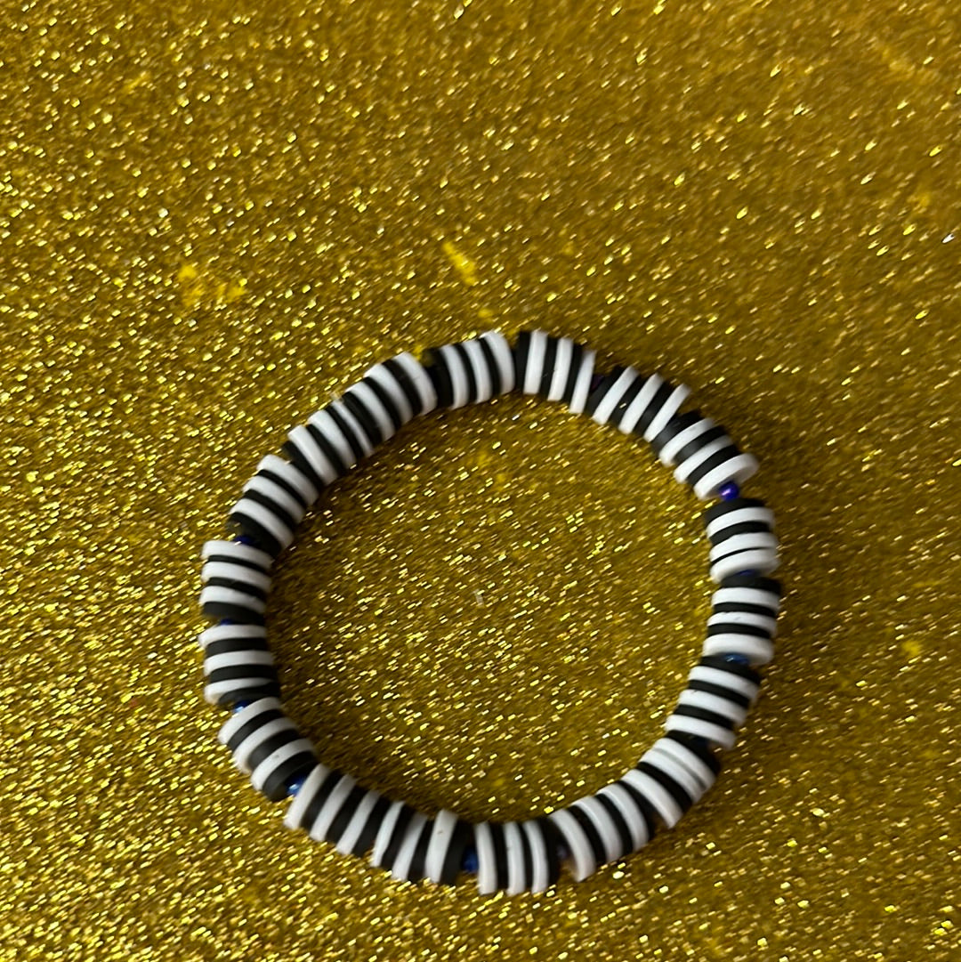 A black and white clay bead bracelet with glass beads